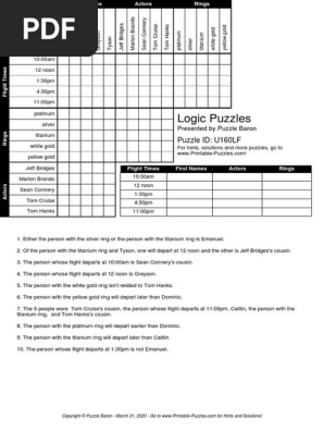 If you like baron s logic puzzles pdf download, you may also like Puzzle barons logic puzzles volume 2. Number puzzles, spatial/visual puzzles, cryptograms, sudoku, kokuro, logic puzzles, and word games like frame games are. Logic puzzles (also known as logic grid puzzles) require the solver to deduce the relationships between different people, places and things based on a limited number of clues given in the puzzle. I have always enjoyed doing logic puzzles myself and decided to make some of my own for my students.